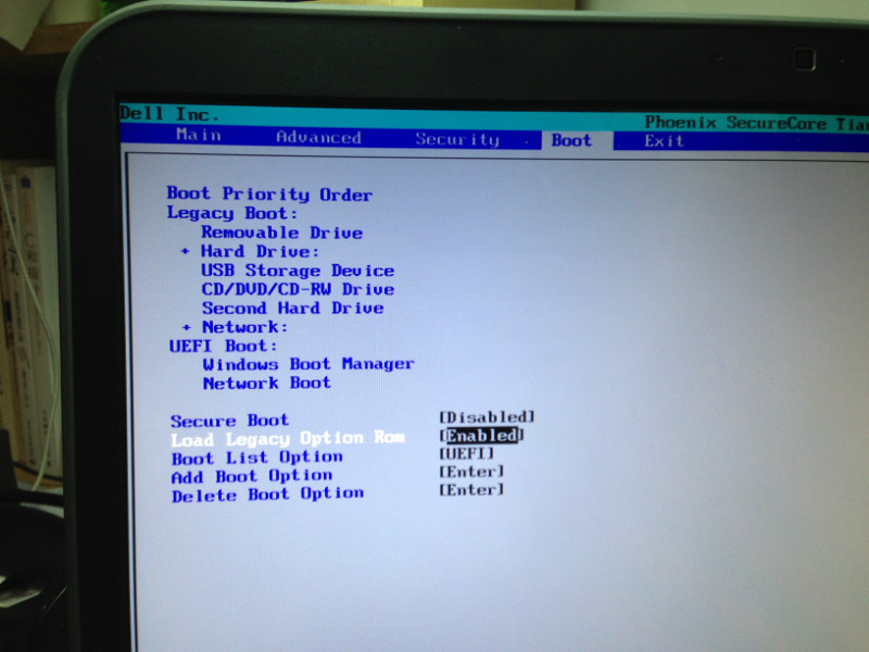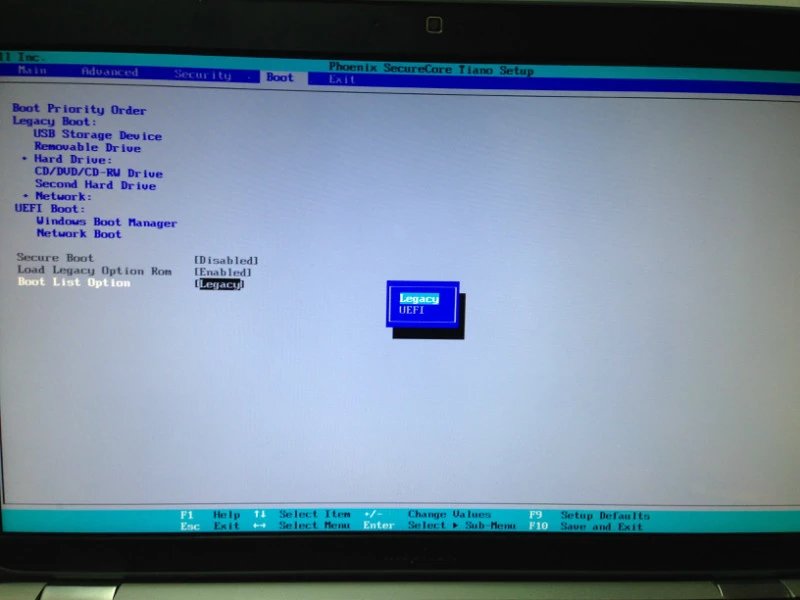 下面是BOOT菜单,这就是预装win8的笔记本比较操蛋的地方:没有USB启动。实际上并不是这样,只不过是因为为了让笔记本初次进入系统的时候,强制进入预装的win8系统,bios菜单项被修改为secure boot了,在这个模式下,boot list option只能是uefi模式,也就是常说的EFI系统, 他区别于以前我们说使用的模式LegacyBIOS(具体参见:http://baike.baidu.com/view/112215.htm)。
