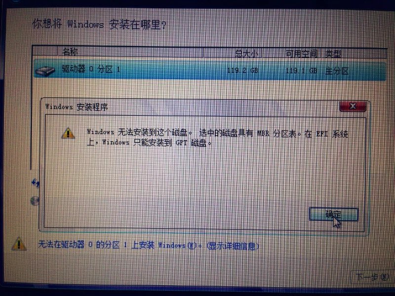 不会出现这种情况(注意gpt会消耗更多的磁盘空间)。一般我们的ssd用来做系统盘,不需要再给他分区了(本身才120G,再分除非你特别无聊)。而我们的ssd选择了mbr出现下图怎么办呢,所以我们需要将上面图中的u盘启动模式boot list option切换很legacy的模式,这样的话就可以顺利的进行安装了。