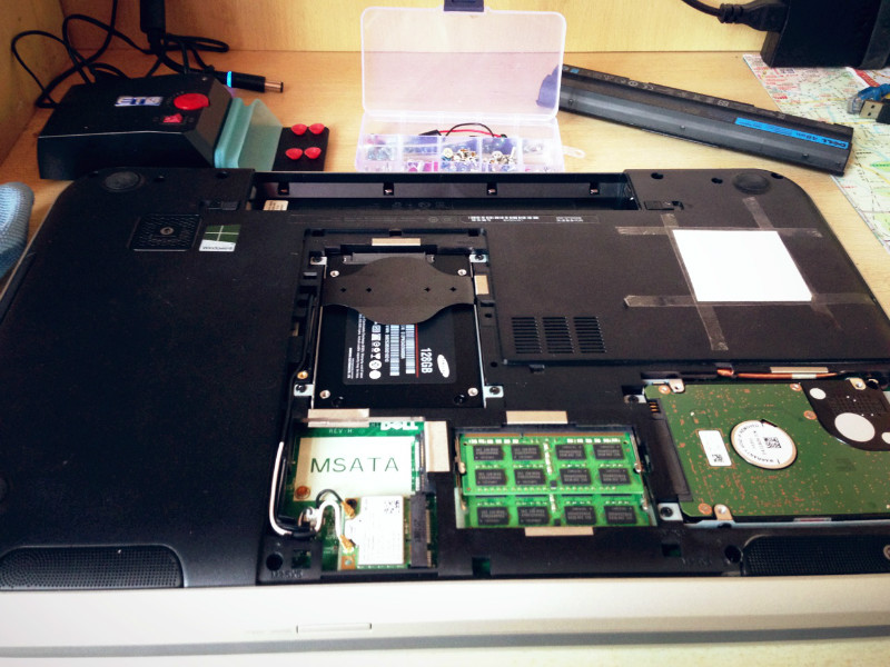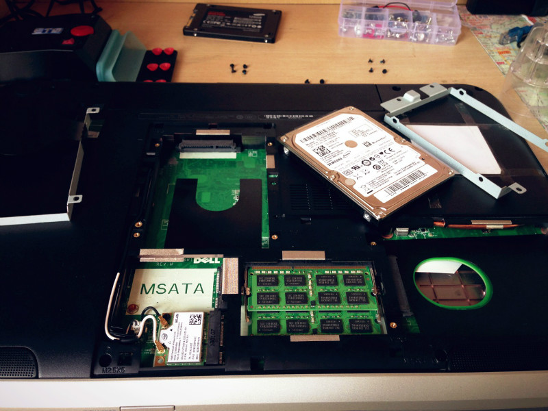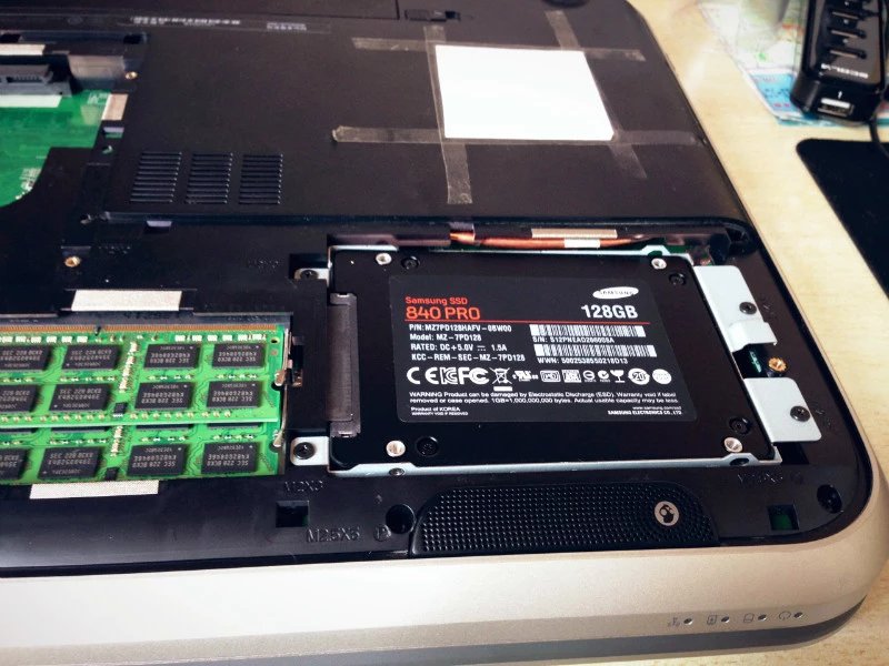 由于我的本子是17寸的,所以有两个硬盘槽,我可以把原来的硬盘拆下来放在副硬盘盘槽里,再把SSD放在主槽内。