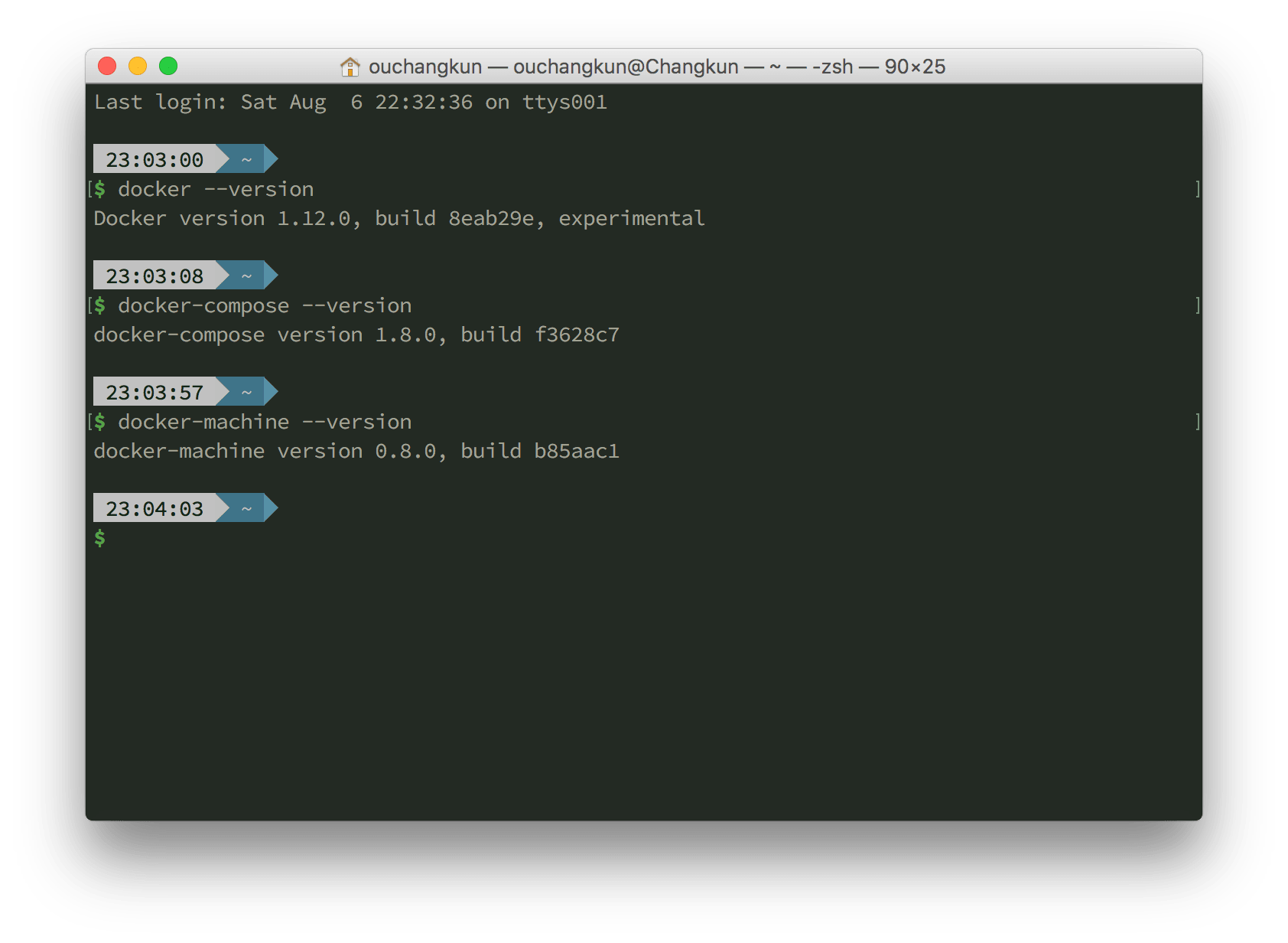 值得一提的是,现在(Docker v1.12) Mac 上的 Docker 已经不再需要使用 Docker ToolBox 了,只需要下载 Docker for Mac,就能够在 命令行工具中使用了: