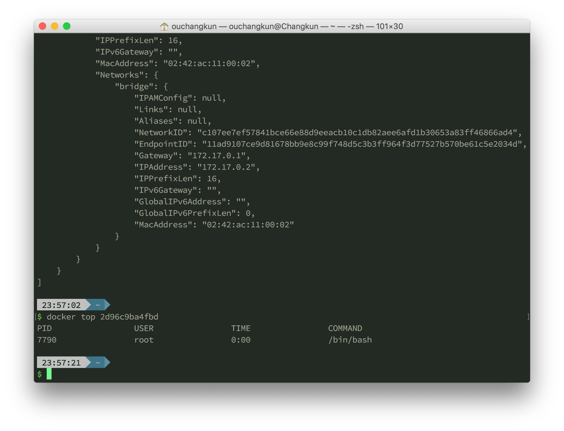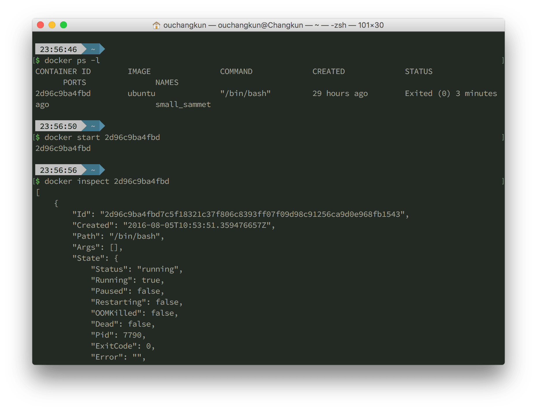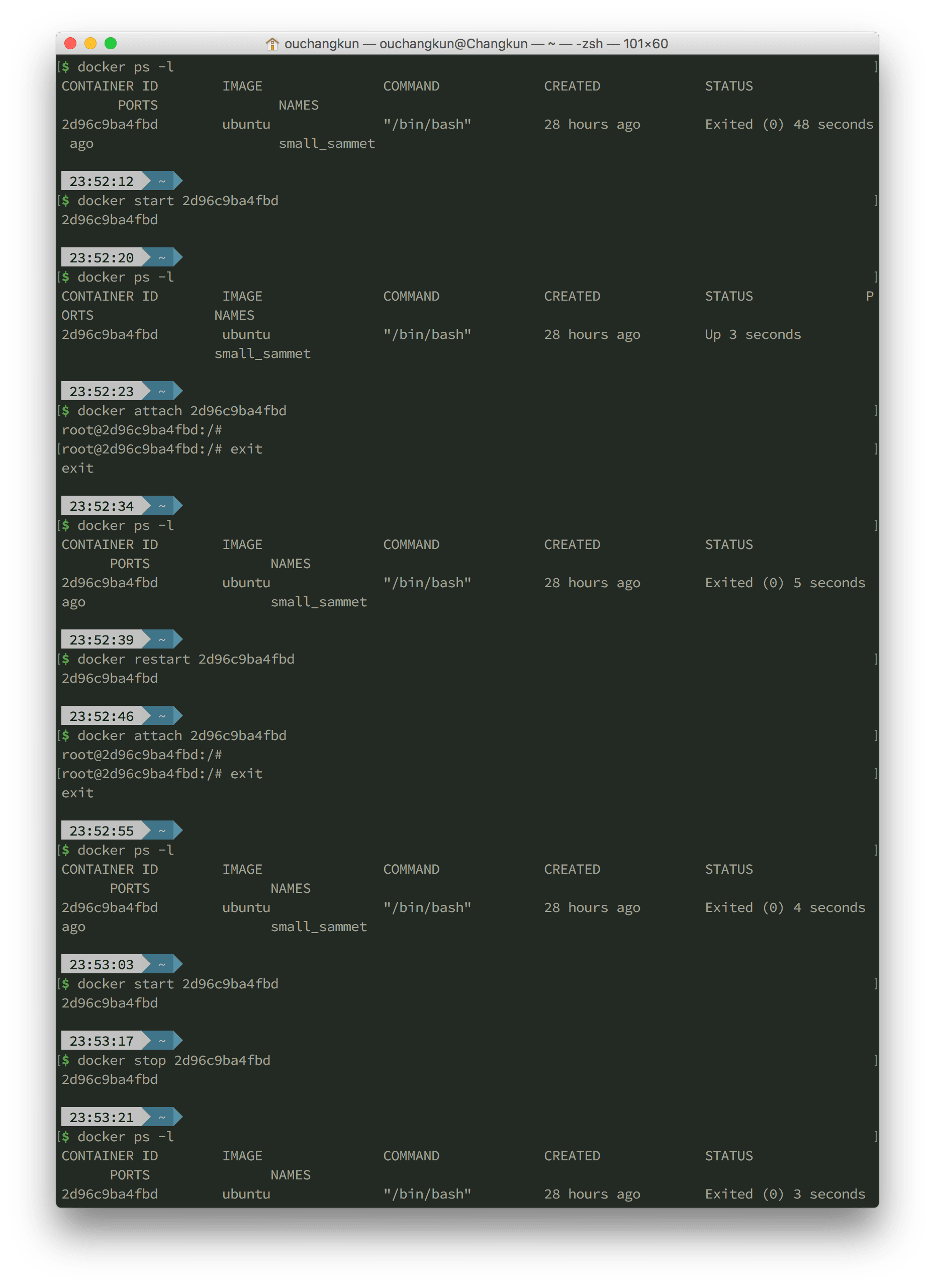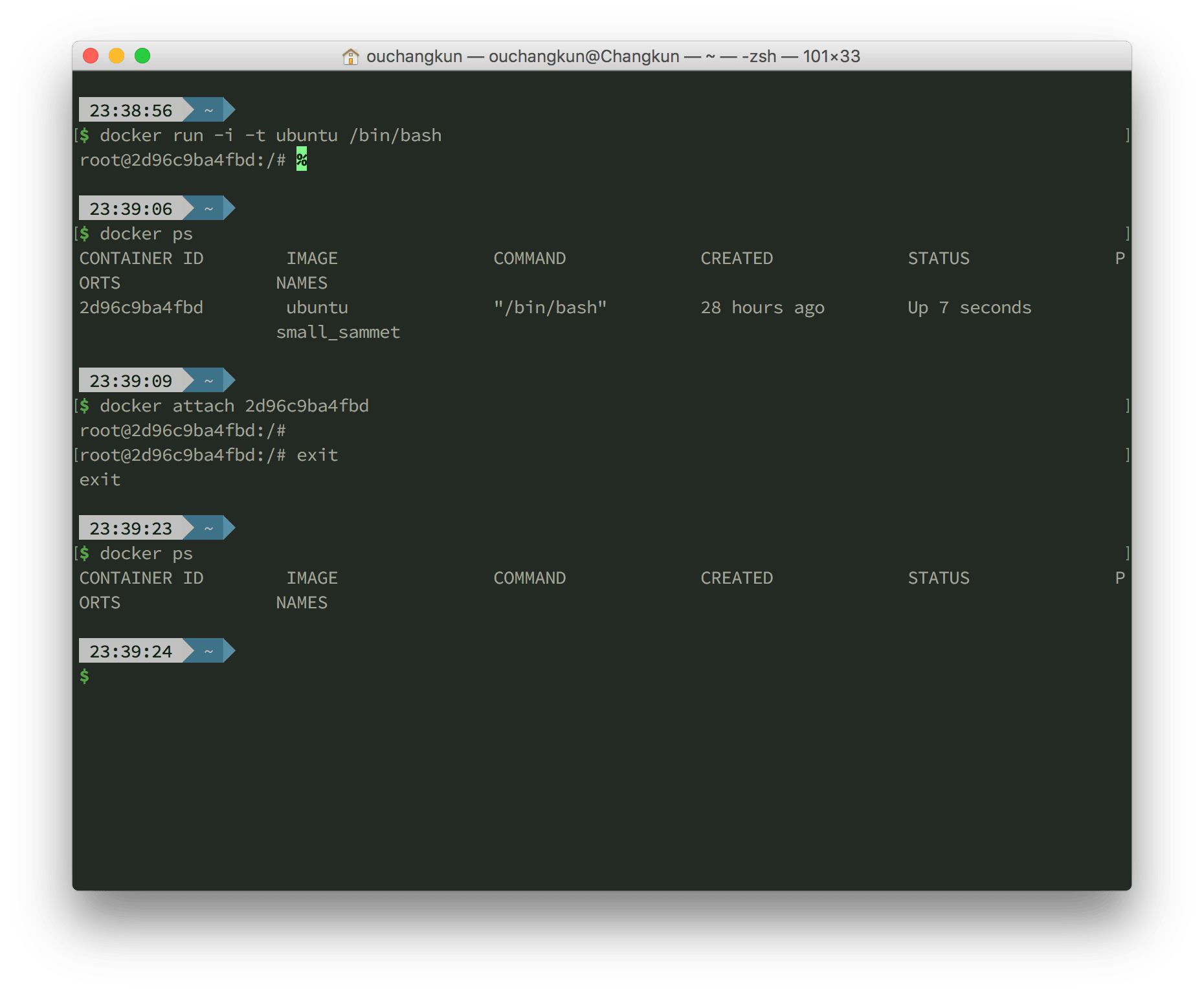如果希望退出后依然保持容器运行,可以使用 Ctrl+p 及 Ctrl+q 两组快捷键,然后使用 docker attach 能够再次进入 bash。