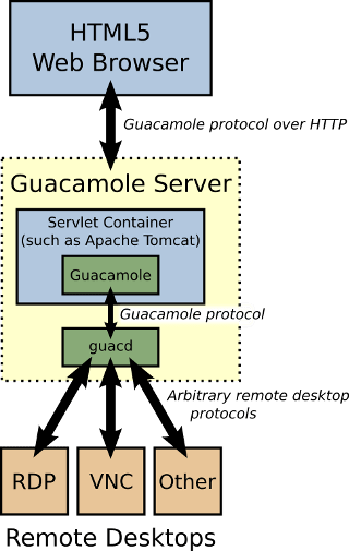 简单来说 Guacamole 提供了浏览器端访问的桌面系统的解决方案。Guacamole 提供的解决方案主要由两部分组成: