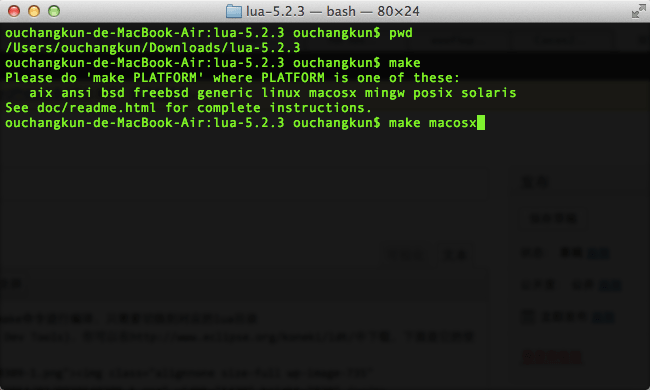 Lua的官方网站为lua.org,你可以下载到整个lua的源码,并且在Mac平台下直接使用make命令进行编译,只需要切换到对应的lua目录使用make命令,之后会提示你需要在什么PLATFORM下进行make,我们输入make macosx即可完成整个编译过程。如图所示。