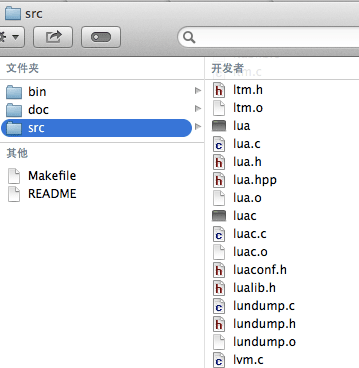 编译完成后我们可以在src目录中看到两个新生成的文件(lua和luac),如图所示。
