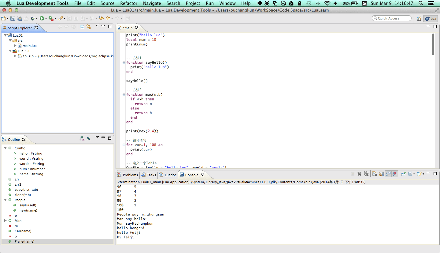在Mac中使用Lua进行开发,有一个比较好用的Eclipse插件,或者是独立版的LDT(Lua Dev Tools),你可以在http://www.eclipse.org/koneki/ldt/中下载,下面是它的使用界面: