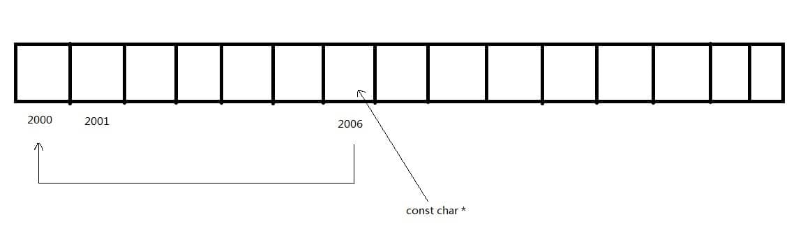 如果要从2006的位置往2000的位置拷贝6个以上的字符时,原本用于防止数据被修改的const char *就显得无力了, 因此,这里写出的效果是2006后的字符串最多只拷贝六个字符到2000-2005。